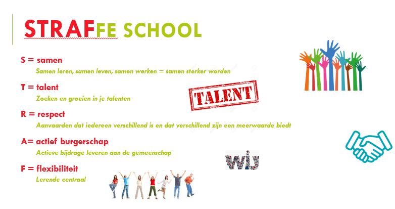 Samen werken we aan een positief school- en klasklimaat waarin er op een positieve wijze wordt omgegaan met diversiteit. Mensen komen met elkaar in verbinding binnen een warm en veilig klimaat. Respect voor elkaar en elkaars verschillen zijn daarbij belangrijke pijlers.